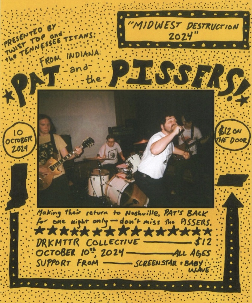 OK y’all, very stoked to put this one on. On October 10th, PAT AND THE PISSERS return to Nashville alongside BABY WAVE and SCREEN STAR.